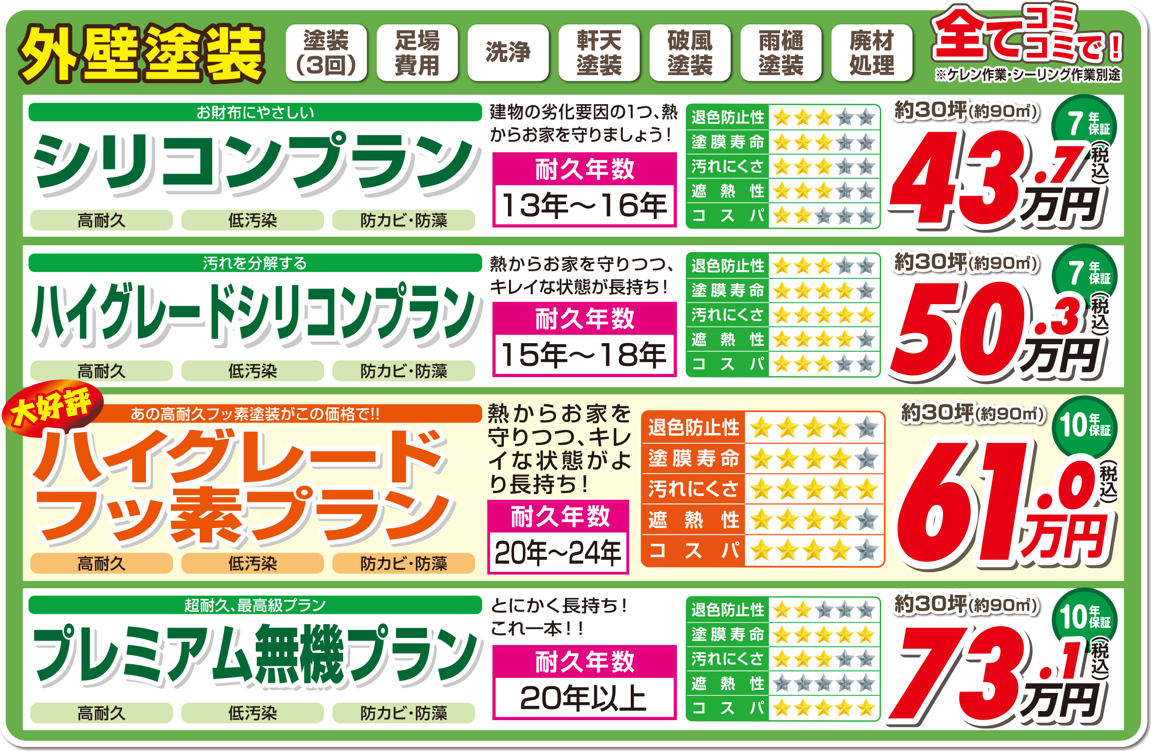 足場費用から洗浄、外壁3回塗りと付帯部の塗装まで全てコミコミで安心価格!ハイグレードフッ素プランが大好評をいただいております!