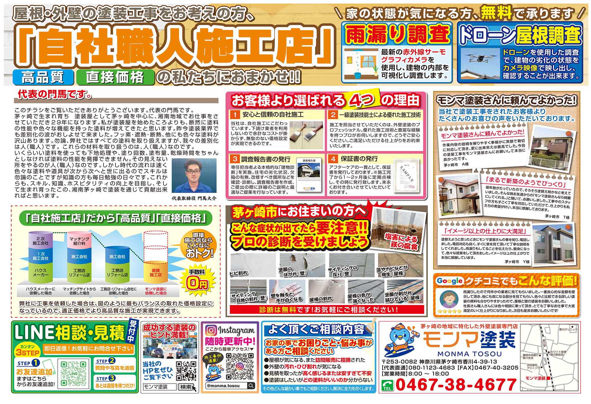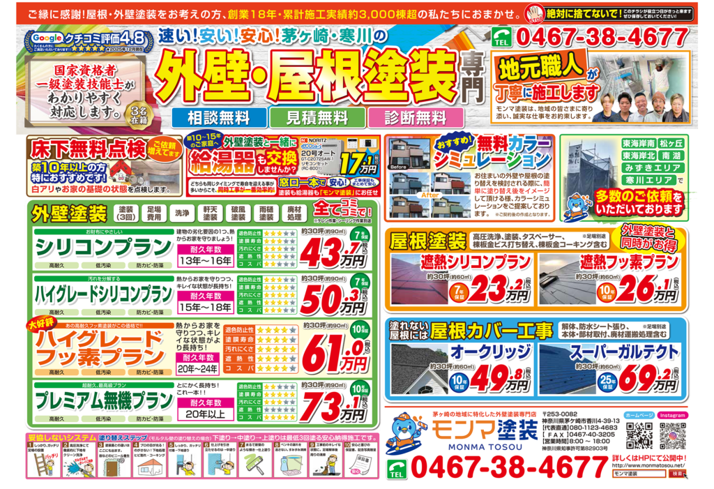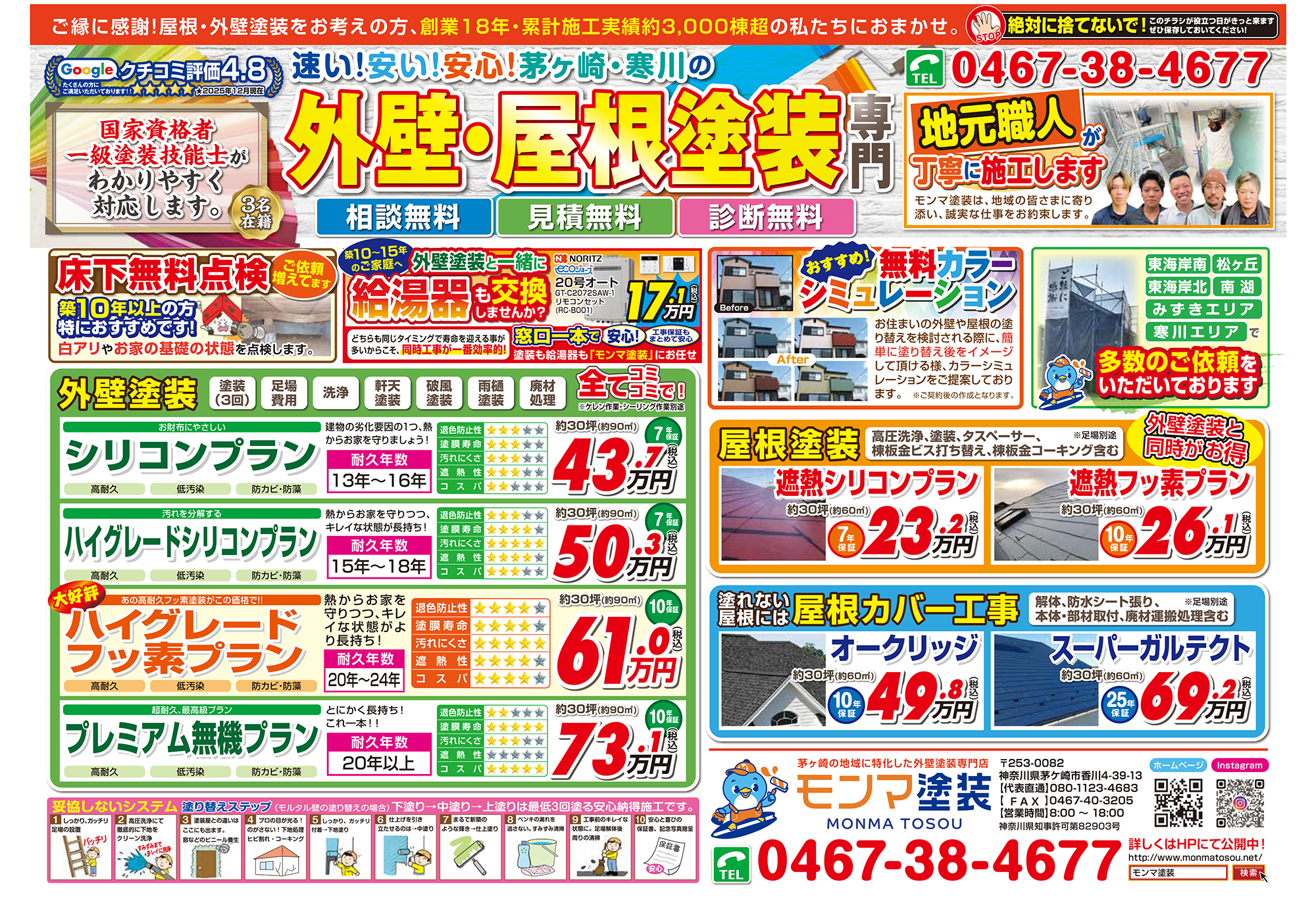茅ヶ崎・寒川で屋根・外壁塗装をお考えの方は、創業18年・地元密着のモンマ塗装におまかせください!
